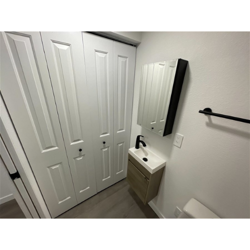 Baño completo: Inodoro alargado de una pieza, lavabo de pared con mueble y grifería Moen, calentador de agua eléctrico, extractor. Opcional: Cabina de ducha de fibra de vidrio de 48″ (1.22m) con grifería Moen.