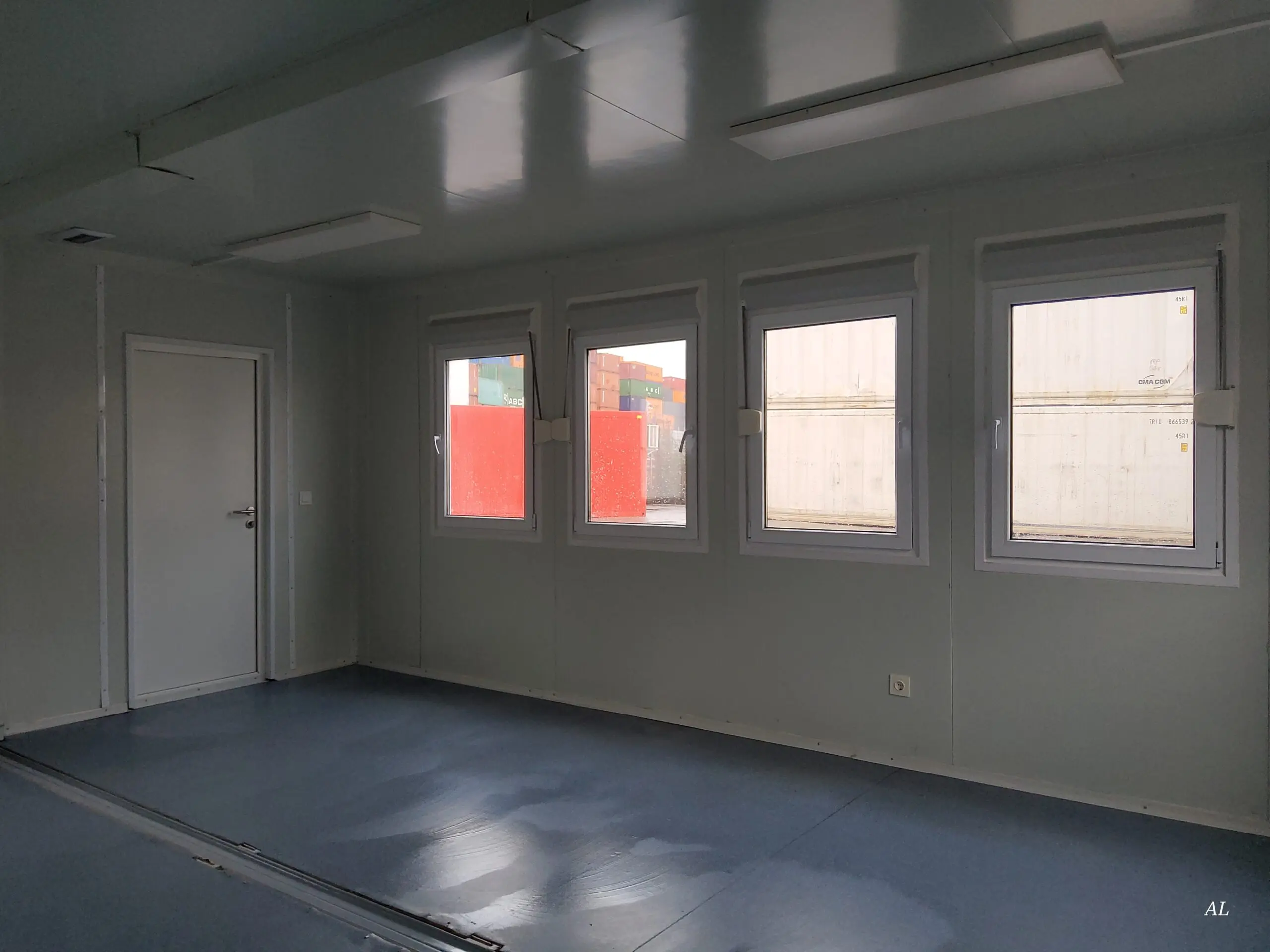 Se trata de un contenedor marítimo reacondicionado y adaptado como oficina, equipado con: